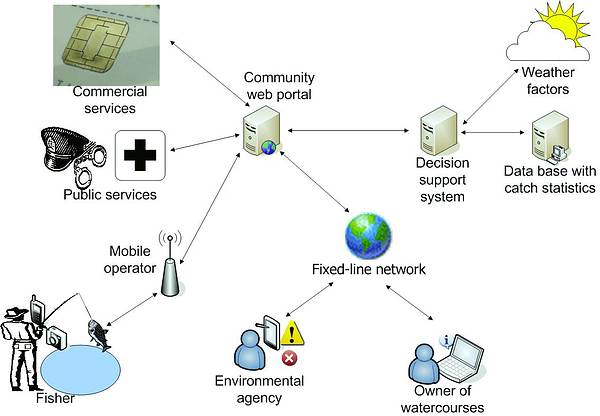 The following picture shows in detail the interconnections between the members of an angling community, the mobile community platform and their services, and further contextual elements, such as databases and public services.