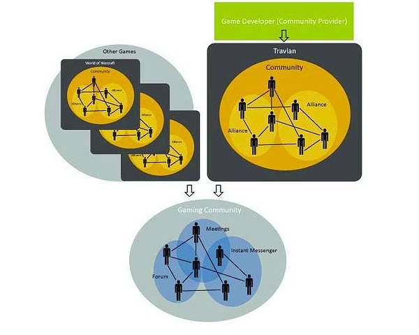 Many players are organized in sub-communities (e.g. clans), who also exist physically in the offline world and, consequently, represent a mechanism to connect people on- and offline. To maintain these relationships, an appropriate infrastructure is needed to allow communication and interaction within these closed groups, even outside of a game like Travian or WoW itself. - Third, an increase in the mobility of gaming communities. Considering the mentioned fact that gaming communities will tend to become more mobile in the future, players need seamless access not only to the games itself, but also to the respective supporting community services.